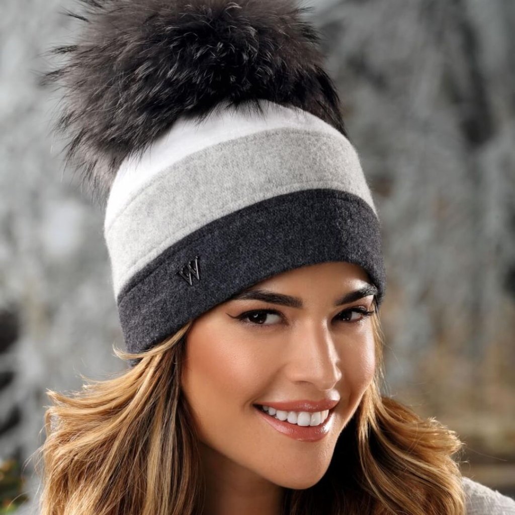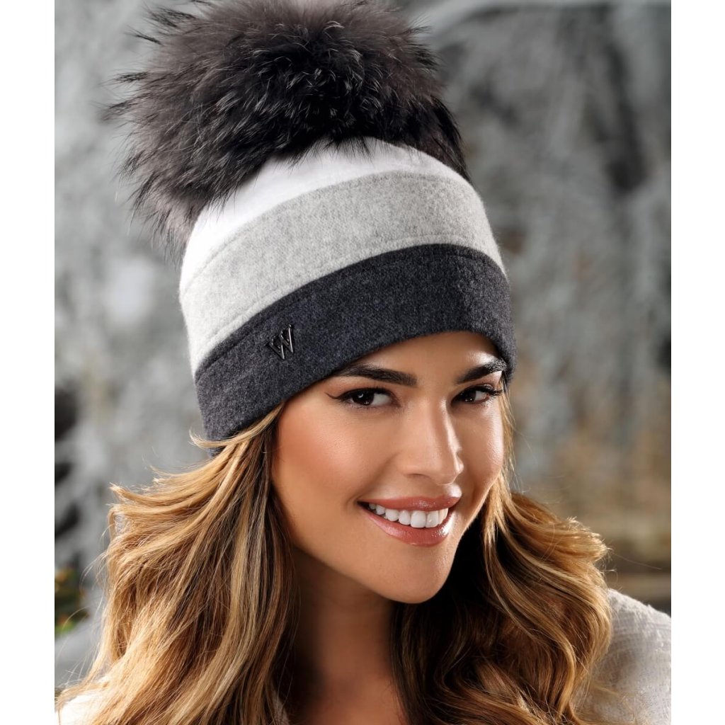 Mimořádně elegantní dámská zimní čepice v úžasné barevné kombinaci barev z nejkvalitnější vlny s certifikátem Woolmark, která se dokonale přizpůsobí každé velikosti hlavy. Je to nádherná vlněná čepice s kožešinovou bambulí. Kombinace tří dokonale sladěných odstínů vlny, dodává dámské čepici kouzlo, díky čemuž se hodí k mnoha stylům. Čepice má teplou flísovou podšívku.
