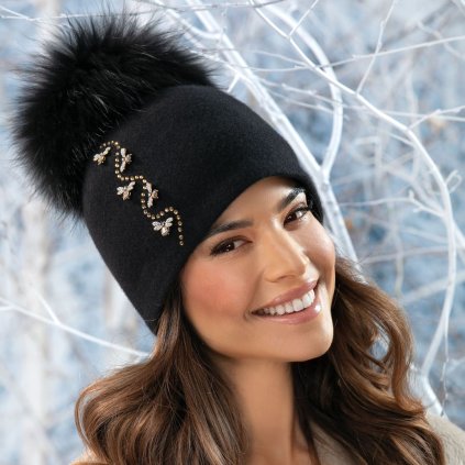 Elegantní černá zimní čepice s velkou přírodní bambulí. Povrch čepice je ručně zdoben sametovým srdcem a korálky, které jí dodávají jedinečný charakter. Díky měkké vlně se výrobek přizpůsobí každé velikosti hlavy. Čepice má uvnitř hřejivou a měkkou flísovou podšívku.