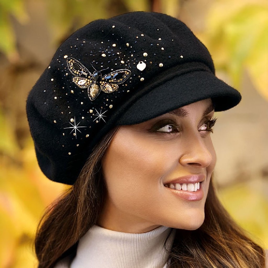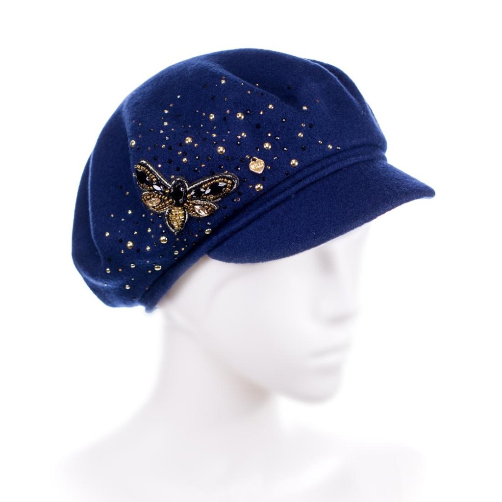 Elegantní modrá zimní čepice s kšiltem z hřejivé a měkké certifikované vlny Woolmark, která se dokonale přizpůsobí každé velikosti hlavy. Jedinečný charakter dámské zimní čepici dodává ručně vytvořená aplikace originálně vyšívaným motýlkem, perličkami a kamínky. Baret s kšiltem má teplou a měkkou podšívku.