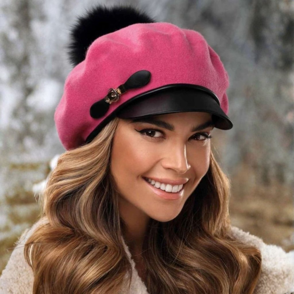 Trendy zimní barety s kšiltem a bambulí nabízíme v široké paletě nádherných barev. Čepice jsou vyrobené z nejkvalitnější hřejivé a měkké vlny, která se dokonale přizpůsobí každé velikosti hlavy. Jedinečný charakter baretu dodává moderní aplikace zlaté přezky v kombinaci s eko-kůží, černý kšilt a olemování z kvalitní eko-kůže. Celek čepice doplňuje přírodní kožešinová bambulka. Dámská čepice s kšiltem má stahující šňůrku v lemu pro pohodlnou regulaci velikosti.