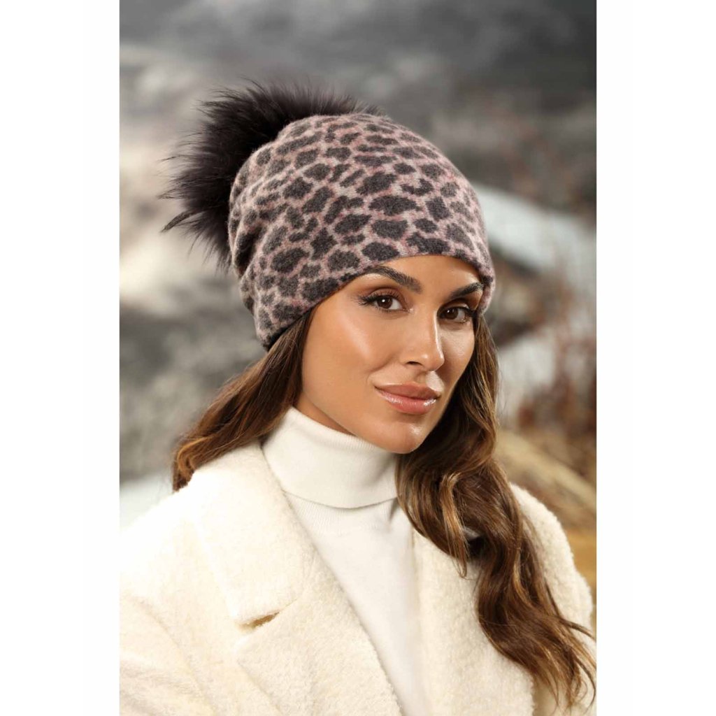 Růžově šedohnědá zimní čepice s bambulí z nejkvalitnější vlny s certifikátem Woolmark, která se dokonale přizpůsobí každé velikosti hlavy. Vlněná čepice má krásný leopardí zvířecí motiv a úžasně slušivý střih. Celek dámské čepice s bambulí je doplněn přírodní kožešinovou bambulí obarvenou do tónu barvy vlny. Dámská čepice má měkkou a hřejivou podšívku a šňůrku v lemu pro pohodlnou regulaci velikosti.