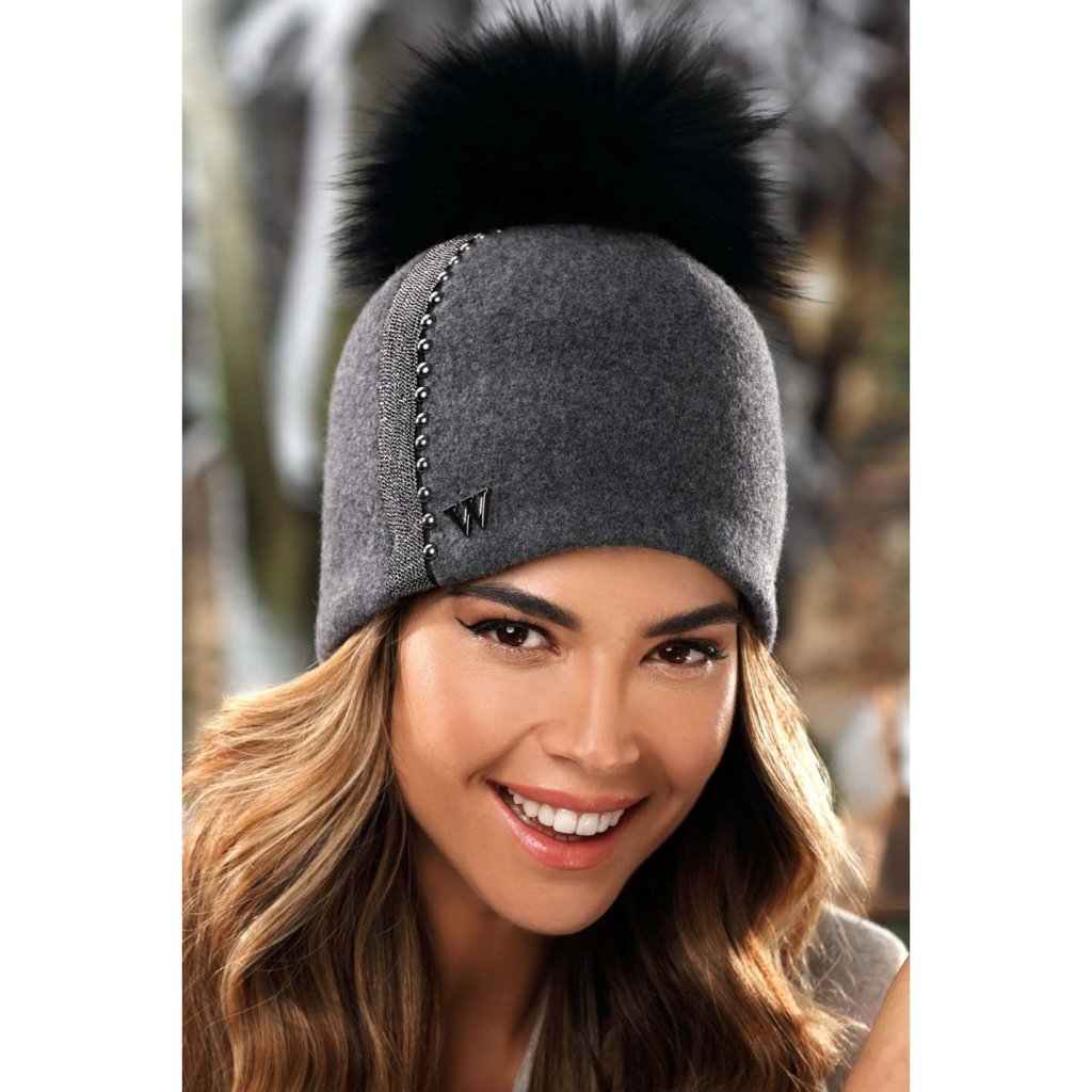 Zimní čepice s bambulí z nejkvalitnější vlny s certifikátem Woolmark, která se dokonale přizpůsobí každé velikosti hlavy. Dámská tmavě šedá čepice je ručně zdobená módním metalickým páskem s výpletem, který lemují kovové cvočky. Celek vlněné čepice je doplněn přírodní černou kožešinovou bambulí.