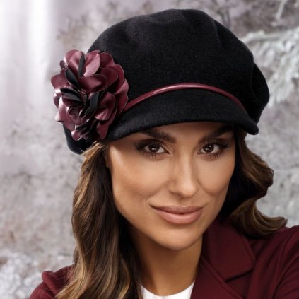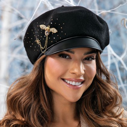 Elegantní černá zimní čepice s kšiltem z hřejivé a měkké certifikované vlny Woolmark quality, která se dokonale přizpůsobí každé velikosti hlavy. Jedinečný charakter dámské zimní čepici dodává zdobení ozdobnými stříbrnými piny. Baret s kšiltem má teplou a měkkou podšívku.