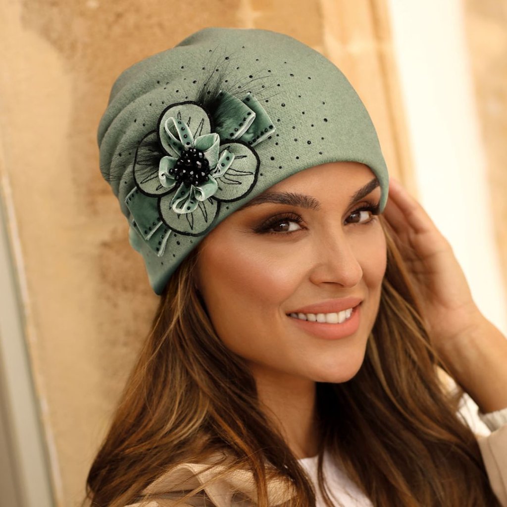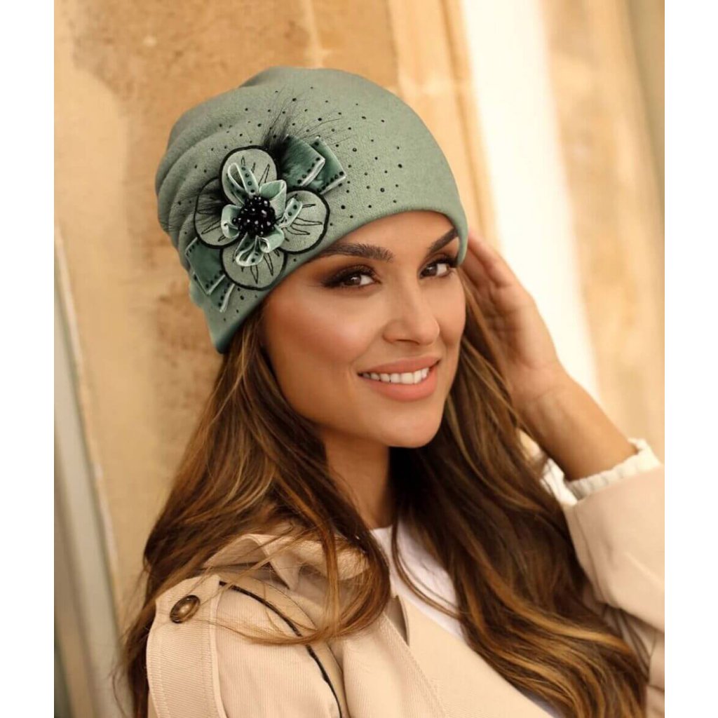 Zimní dámská čepice s květem W-0787/306 světle zelená