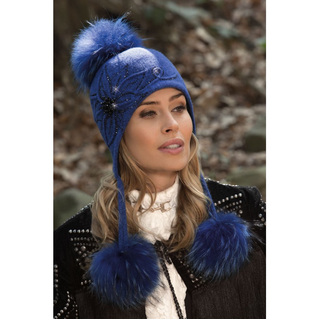 Originální zimní vlněná čepice je ozdobená třemi kožešinovými bambulemi tón v tónu a ručně vyšívanou aplikaci květiny s černými broušenými korálky. Skvělý střih čepice vám bude dobře sedět a spodní dvě bambule krásně ozdobí vaší bundu nebo kabátek. Čepice má krásnou modrou melanž barvu, kterou lehce doladíte k jakékoli další barvě vašeho outfitu. Tepelný komfort v mrazivém počasí zaručí 100% vlna a flísová podšívka.