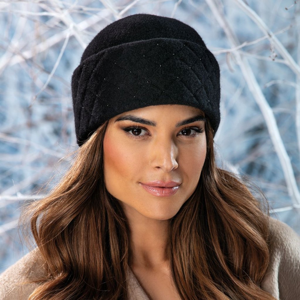 Širší polstrovaný lem zajišťuje, že čepice pevně sedí, krásně lemuje obličej a drží tvar. Výjimečným prvkem jsou jemné kamínky tón v tónu, které decentně ladí s barvou vlny a dodávají čepici jemný lesk bez rušivého efektu.