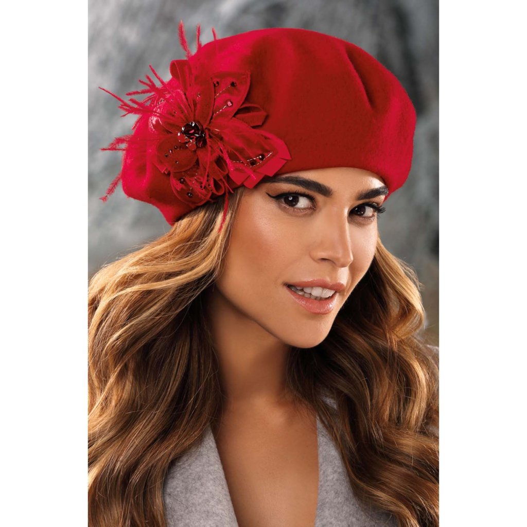 Zimní dámský baret s květem W-0759/001 červený