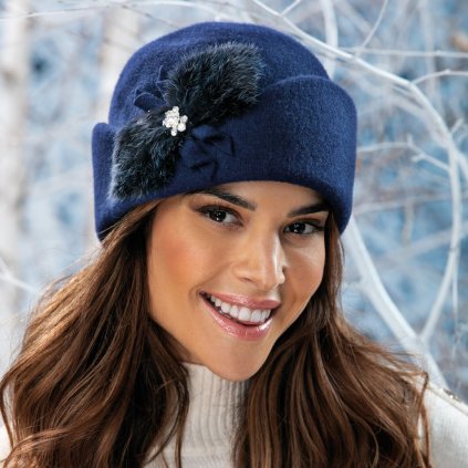 Dámský zimní modrý klobouk z nejkvalitnější vlny s certifikátem Woolmark, která se dokonale přizpůsobí každé velikosti hlavy. Je to nádherný vlněný klobouk s klasickou malou krempou a ručně zdobený krásnou aplikací z vlny. Vlněný klobouk je dostatečně hluboký a měkoučký, proto v zimních měsících plně nahradí čepici. Klobouček má krempu, která drží tvar, ale zároveň je ohebná a nevadí tak ani vyššímu límci u kabátu nebo šále.