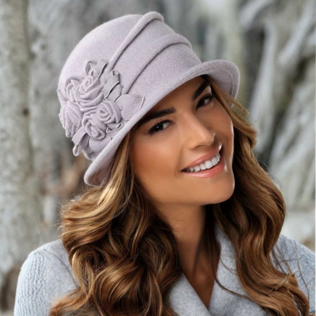 Elegantní dámský zimní klobouk z nejkvalitnější vlny s certifikátem Woolmark, která se dokonale přizpůsobí každé velikosti hlavy. Je to nádherný vlněný šedý klobouk s klasickou malou krempou a ručně tvořenou květinovou aplikací. Klobouk je dostatečně hluboký a měkoučký, proto v zimních měsících plně nahradí čepici. Klobouček má krempu, která drží tvar, ale zároveň je ohebná a nevadí tak ani vyššímu límci u kabátu nebo šále.