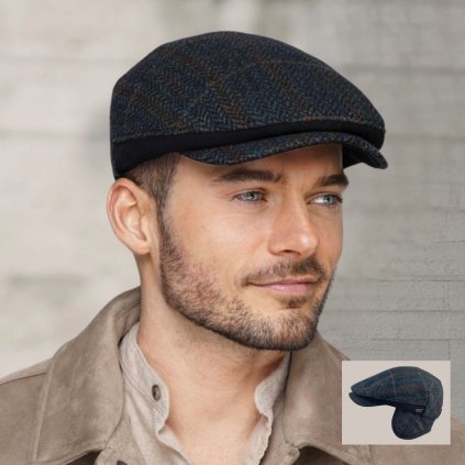 Zimní modrá bekovka - twídová bekovka (skryté ušní klapky)